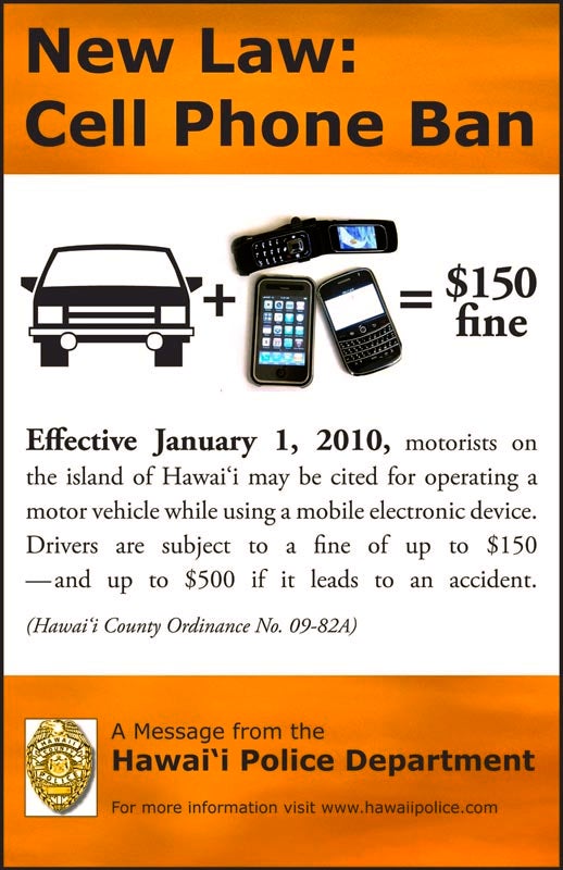 In August, the Hawai’i County Council passed County Ordinance 09-82A, which will make it illegal to use a cell phone or other mobile electronic device while driving-except with a hands-free mechanism. The ordinance was signed into law by the mayor. It takes effect on January 1.