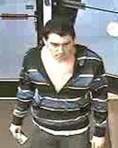 The suspect was described as a Caucasian, in his mid-to-late 20s, about 6-foot-1 to 6-foot-2, about 185 to 200 pounds with short wavy black hair and facial acne. He was last seen wearing a blue-and-black striped pullover, jeans, and black shoes with red laces.