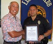 Aloha Exchange Club Representative Joey Estrella presents an ‘Officer of the Month’ award to Officer Erhard Autrata.